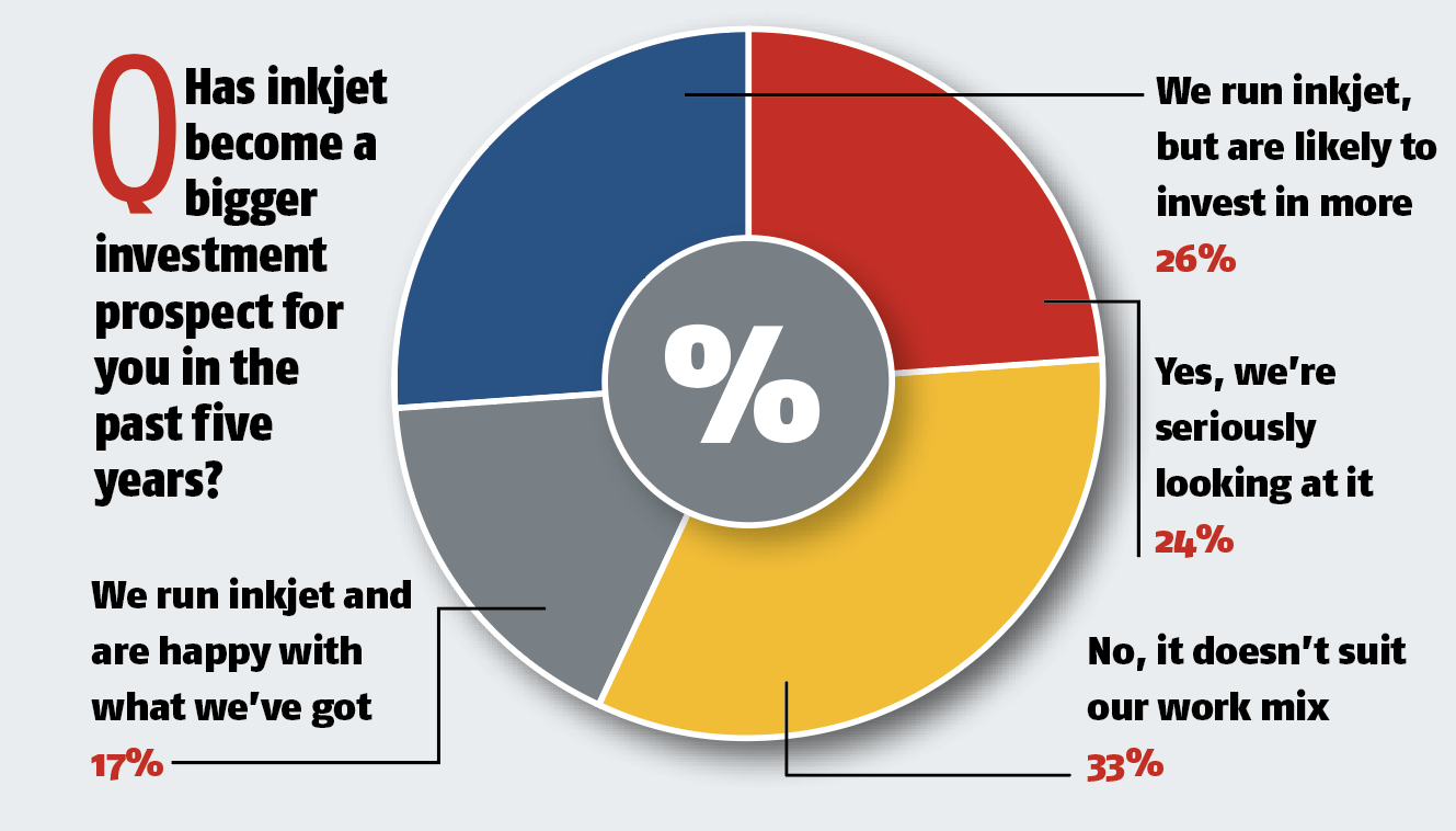The appetite is clearly growing, though – a recent Printweek poll that asked “Has inkjet become a bigger investment prospect for you in the past five years?” found that while one-third (33%) said it did not suit their work mix, the remainder were either now seriously looking at it (24%) or already running inkjet and likely to invest in more (26%), or happy with what they’ve got (17%).